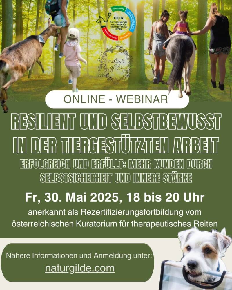 Die Naturgilde TGI Webinare bieten Fachkräften in der tiergestützten Arbeit eine wertvolle Möglichkeit, ihr Wissen und ihre Fähigkeiten zu erweitern. Im Mittelpunkt steht dabei nicht nur die Förderung der Bedürfnisse der Tiere, sondern auch die Stärkung der Fachkräfte selbst. Durch praxisorientierte Inhalte und wertvolle Erkenntnisse werden Sie in die Lage versetzt, Ihre Arbeit mit mehr Selbstbewusstsein und Sicherheit zu gestalten. Indem den Fachkräften das nötige Wissen an die Hand gegeben wird, können Sie sowohl das Wohl der Tiere als auch die bestmöglichen Bedingungen für Ihre Klient*innen schaffen, was zu einer harmonischen und effektiven Zusammenarbeit führt.